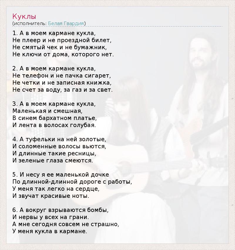1. А в моем кармане кукла, Не плеер и не проездной билет, Не смятый чек и не бумажник, Не ключи от дома, которого нет. 2. А в моем кармане кукла, Не телефон и не пачка сигарет, Не четки и не записная книжка, Не счет за воду, за газ и за свет. 3. А в моем кармане кукла, Маленькая и смешная, В синем бархатном платье, И лента в волосах голубая. 4. А туфельки на ней золотые, И соломенные волосы вьются, И длинные такие ресницы, И зеленые глаза смеются. 5. И несу я ее маленькой дочке По длинной-длинной дороге с работы, У меня так легко на сердце, И звучат красивые ноты. 6. А вокруг взрываются бомбы, И нервы у всех на грани. А мне сегодня совсем не страшно, У меня кукла в кармане.
