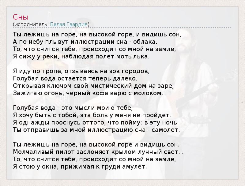 Ты лежишь на горе, на высокой горе, и видишь сон, А по небу плывут иллюстрации сна - облака. То, что снится тебе, происходит со мной на земле, Я сижу у реки, наблюдая полет мотылька. Я иду по тропе, отзываясь на зов городов, Голубая вода остается теперь далеко. Открывая ключом свой мистический дом на заре, Зажигаю огонь, черный кофе варю с молоком. Голубая вода - это мысли мои о тебе, Я хочу быть с тобой, эта боль у меня не пройдет. Я однажды проснусь оттого, что пойму: в эту ночь Ты отправишь за мной иллюстрацию сна - самолет. Ты лежишь на горе, на высокой горе и видишь сон. Молчаливый пилот заслоняет крылом лунный свет... То, что снится тебе, происходит со мной на земле, Я стою у окна, прижимая к груди амулет.