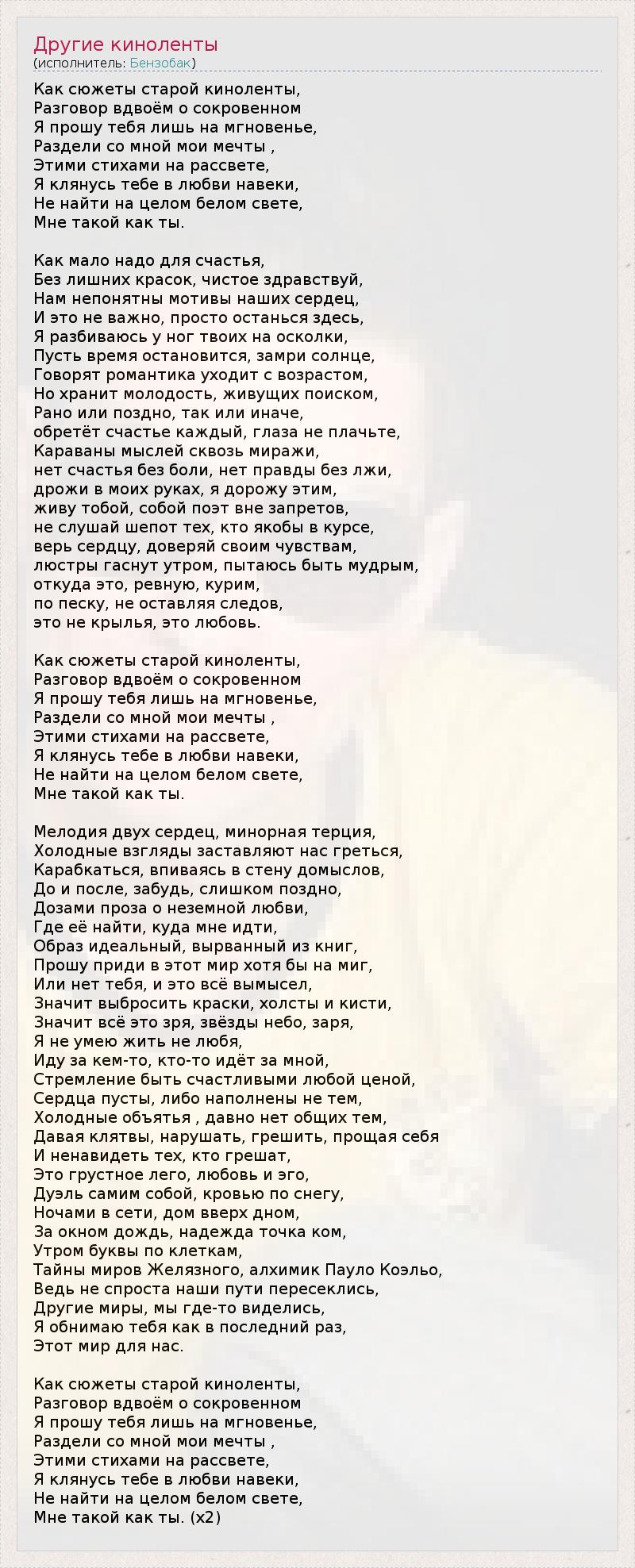 Как сюжеты старой киноленты, Разговор вдвоём о сокровенном Я прошу тебя лишь на мгновенье, Раздели со мной мои мечты , Этими стихами на рассвете, Я клянусь тебе в любви навеки, Не найти на целом белом свете, Мне такой как ты. Как мало надо для счастья, Без лишних красок, чистое здравствуй, Нам непонятны мотивы наших сердец, И это не важно, просто останься здесь, Я разбиваюсь у ног твоих на осколки, Пусть время остановится, замри солнце, Говорят романтика уходит с возрастом, Но хранит молодость, живущих поиском, Рано или поздно, так или иначе, обретёт счастье каждый, глаза не плачьте, Караваны мыслей сквозь миражи, нет счастья без боли, нет правды без лжи, дрожи в моих руках, я дорожу этим, живу тобой, собой поэт вне запретов, не слушай шепот тех, кто якобы в курсе, верь сердцу, доверяй своим чувствам, люстры гаснут утром, пытаюсь быть мудрым, откуда это, ревную, курим, по песку, не оставляя следов, это не крылья, это любовь. Как сюжеты старой киноленты, Разговор вдвоём о сокровенном Я прошу тебя лишь на мгновенье, Раздели со мной мои мечты , Этими стихами на рассвете, Я клянусь тебе в любви навеки, Не найти на целом белом свете, Мне такой как ты. Мелодия двух сердец, минорная терция, Холодные взгляды заставляют нас греться, Карабкаться, впиваясь в стену домыслов, До и после, забудь, слишком поздно, Дозами проза о неземной любви, Где её найти, куда мне идти, Образ идеальный, вырванный из книг, Прошу приди в этот мир хотя бы на миг, Или нет тебя, и это всё вымысел, Значит выбросить краски, холсты и кисти, Значит всё это зря, звёзды небо, заря, Я не умею жить не любя, Иду за кем-то, кто-то идёт за мной, Стремление быть счастливыми любой ценой, Сердца пусты, либо наполнены не тем, Холодные объятья , давно нет общих тем, Давая клятвы, нарушать, грешить, прощая себя И ненавидеть тех, кто грешат, Это грустное лего, любовь и эго, Дуэль самим собой, кровью по снегу, Ночами в сети, дом вверх дном, За окном дождь, надежда точка ком, Утром буквы по клеткам, Тайны миров Желязного, алхимик Пауло Коэльо, Ведь не спроста наши пути пересеклись, Другие миры, мы где-то виделись, Я обнимаю тебя как в последний раз, Этот мир для нас. Как сюжеты старой киноленты, Разговор вдвоём о сокровенном Я прошу тебя лишь на мгновенье, Раздели со мной мои мечты , Этими стихами на рассвете, Я клянусь тебе в любви навеки, Не найти на целом белом свете, Мне такой как ты. (х2)
