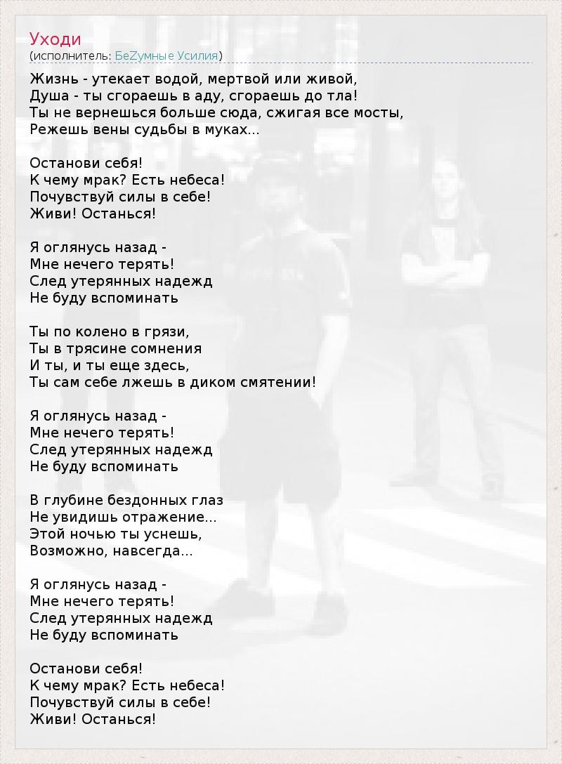 Жизнь - утекает водой, мертвой или живой, Душа - ты сгораешь в аду, сгораешь до тла! Ты не вернешься больше сюда, сжигая все мосты, Режешь вены судьбы в муках... Останови себя! К чему мрак? Есть небеса! Почувствуй силы в себе! Живи! Останься! Я оглянусь назад - Мне нечего терять! След утерянных надежд Не буду вспоминать Ты по колено в грязи, Ты в трясине сомнения И ты, и ты еще здесь, Ты сам себе лжешь в диком смятении! Я оглянусь назад - Мне нечего терять! След утерянных надежд Не буду вспоминать В глубине бездонных глаз Не увидишь отражение... Этой ночью ты уснешь, Возможно, навсегда... Я оглянусь назад - Мне нечего терять! След утерянных надежд Не буду вспоминать Останови себя! К чему мрак? Есть небеса! Почувствуй силы в себе! Живи! Останься!
