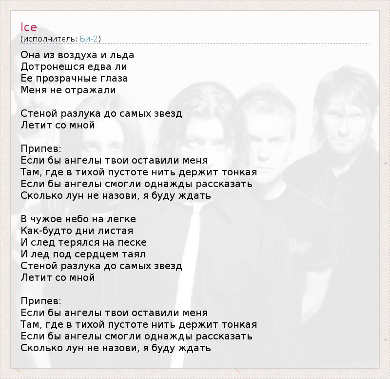 Она из воздуха и льда Дотронешся едва ли Ее прозрачные глаза Меня не отражали Стеной разлука до самых звезд Летит со мной Припев: Если бы ангелы твои оставили меня Там, где в тихой пустоте нить держит тонкая Если бы ангелы смогли однажды рассказать Сколько лун не назови, я буду ждать В чужое небо на легке Как-будто дни листая И след терялся на песке И лед под сердцем таял Стеной разлука до самых звезд Летит со мной Припев: Если бы ангелы твои оставили меня Там, где в тихой пустоте нить держит тонкая Если бы ангелы смогли однажды рассказать Сколько лун не назови, я буду ждать