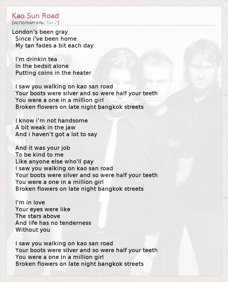 London's been gray Since i've been home My tan fades a bit each day I'm drinkin tea In the bedsit alone Putting coins in the heater I saw you walking on kao san road Your boots were silver and so were half your teeth You were a one in a million girl Broken flowers on late night bangkok streets I know i'm not handsome A bit weak in the jaw And i haven't got a lot to say And it was your job To be kind to me Like anyone else who'll pay I saw you walking on kao san road Your boots were silver and so were half your teeth You were a one in a million girl Broken flowers on late night bangkok streets I'm in love Your eyes were like The stars above And life has no tenderness Without you I saw you walking on kao san road Your boots were silver and so were half your teeth You were a one in a million girl Broken flowers on late night bangkok streets