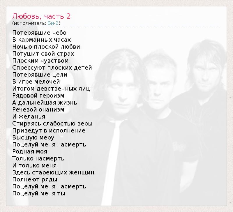 Потерявшие небо В карманных часах Ночью плоской любви Потушит свой страх Плоским чувством Спрессуют плоских детей Потерявшие цели В игре мелочей Итогом девственных лиц Рядовой героизм А дальнейшая жизнь Речевой онанизм И желанья Стираясь слабостью веры Приведут в исполнение Высшую меру Поцелуй меня насмерть Родная моя Только насмерть И только меня Здесь стареющих женщин Полнеют ряды Поцелуй меня насмерть Поцелуй меня ты