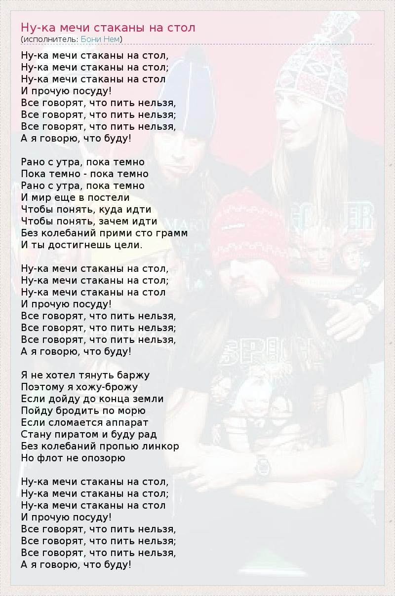 ГлавнаяИсполнителиБони НемНу-ка мечи стаканы на стол