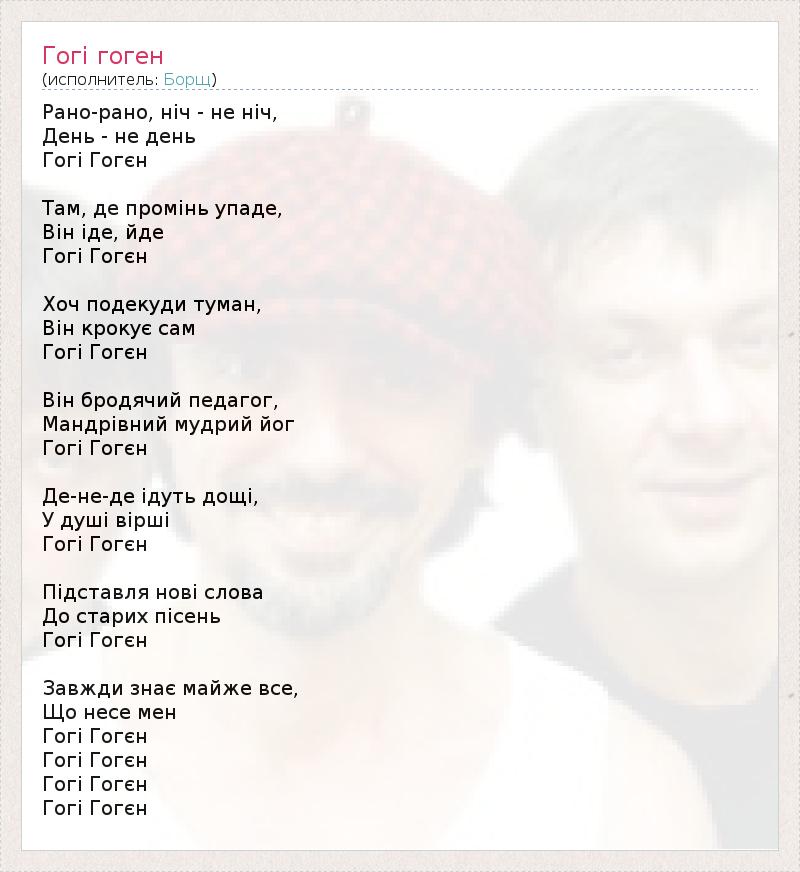 Рано-рано, ніч - не ніч, День - не день Гогі Гогєн Там, де промінь упаде, Він іде, йде Гогі Гогєн Хоч подекуди туман, Він крокує сам Гогі Гогєн Він бродячий педагог, Мандрівний мудрий йог Гогі Гогєн Де-не-де ідуть дощі, У душі вірші Гогі Гогєн Підставля нові слова До старих пісень Гогі Гогєн Завжди знає майже все, Що несе мен Гогі Гогєн Гогі Гогєн Гогі Гогєн Гогі Гогєн