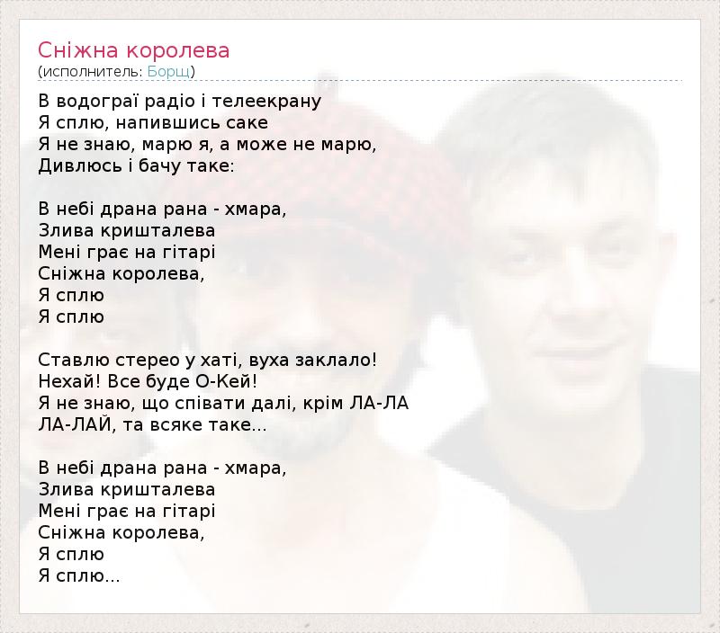 В водограї радіо і телеекрану Я сплю, напившись саке Я не знаю, марю я, а може не марю, Дивлюсь і бачу таке: В небі драна рана - хмара, Злива кришталева Мені грає на гітарі Сніжна королева, Я сплю Я сплю Ставлю стерео у хаті, вуха заклало! Нехай! Все буде О-Кей! Я не знаю, що співати далі, крім ЛА-ЛА ЛА-ЛАЙ, та всяке таке... В небі драна рана - хмара, Злива кришталева Мені грає на гітарі Сніжна королева, Я сплю Я сплю...