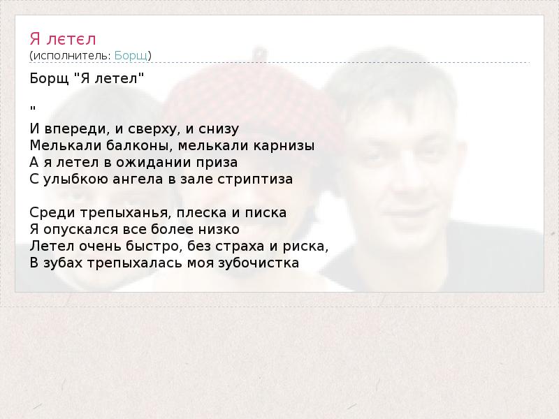 Борщ "Я летел" " И впереди, и сверху, и снизу Мелькали балконы, мелькали карнизы А я летел в ожидании приза С улыбкою ангела в зале стриптиза Среди трепыханья, плеска и писка Я опускался все более низко Летел очень быстро, без страха и риска, В зубах трепыхалась моя зубочистка