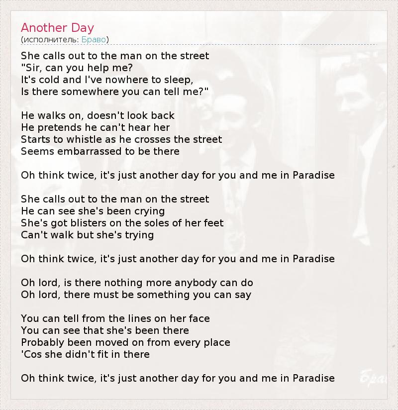Она обращается к прохожему на улице: "Сэр, вы не могли бы мне помочь? Здесь холодно, а мне негде остановиться на ночлег, Не подскажите ли мне, куда я могу пойти?.." Он продолжает идти, не оглядываясь, Притворяется, что не слышит её. Переходя на другую сторону улицы, начал что-то насвистывать, Чтобы скрыть смущение. О, подумай дважды, ведь это просто ещё один день в раю для нас с тобой. Она обращается к прохожему на улице, Он видит, что она плакала. Её ноги в мозолях, Она уже не может идти, но всё равно старается... О, подумай дважды, ведь это просто один лишний день в раю для нас с тобой. О, Всевышний, неужели никто ничего не сможет изменить? О, Всевышний, неужели тебе нечего сказать? На её лице можно было прочесть, Через что она прошла за свою жизнь. Наверное, её прогоняли везде, Нигде не находилось ей места. О, подумай дважды, ведь это просто ещё один лишний день в раю для нас с тобой.