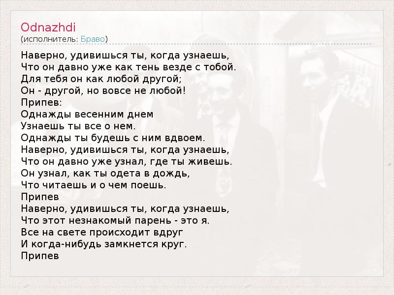 Наверно, удивишься ты, когда узнаешь, Что он давно уже как тень везде с тобой. Для тебя он как любой другой; Он - другой, но вовсе не любой! Припев: Однажды весенним днем Узнаешь ты все о нем. Однажды ты будешь с ним вдвоем. Наверно, удивишься ты, когда узнаешь, Что он давно уже узнал, где ты живешь. Он узнал, как ты одета в дождь, Что читаешь и о чем поешь. Припев Наверно, удивишься ты, когда узнаешь, Что этот незнакомый парень - это я. Все на свете происходит вдруг И когда-нибудь замкнется круг. Припев