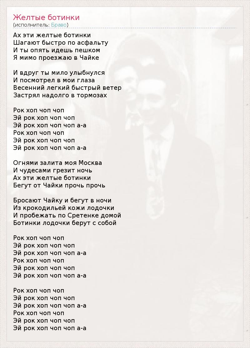 Ах эти желтые ботинки Шагают быстро по асфальту И ты опять идешь пешком Я мимо проезжаю в Чайке И вдруг ты мило улыбнулся И посмотрел в мои глаза Весенний легкий быстрый ветер Застрял надолго в тормозах Рок хоп чоп чоп Эй рок хоп чоп чоп Эй рок хоп чоп чоп а-а Рок хоп чоп чоп Эй рок хоп чоп чоп Эй рок хоп чоп чоп а-а Огнями залита моя Москва И чудесами грезит ночь Ах эти желтые ботинки Бегут от Чайки прочь прочь Бросают Чайку и бегут в ночи Из крокодильей кожи лодочки И пробежать по Сретенке домой Ботинки лодочки берут с собой Рок хоп чоп чоп Эй рок хоп чоп чоп Эй рок хоп чоп чоп а-а Рок хоп чоп чоп Эй рок хоп чоп чоп Эй рок хоп чоп чоп а-а Рок хоп чоп чоп Эй рок хоп чоп чоп Эй рок хоп чоп чоп а-а Рок хоп чоп чоп Эй рок хоп чоп чоп Эй рок хоп чоп чоп а-а