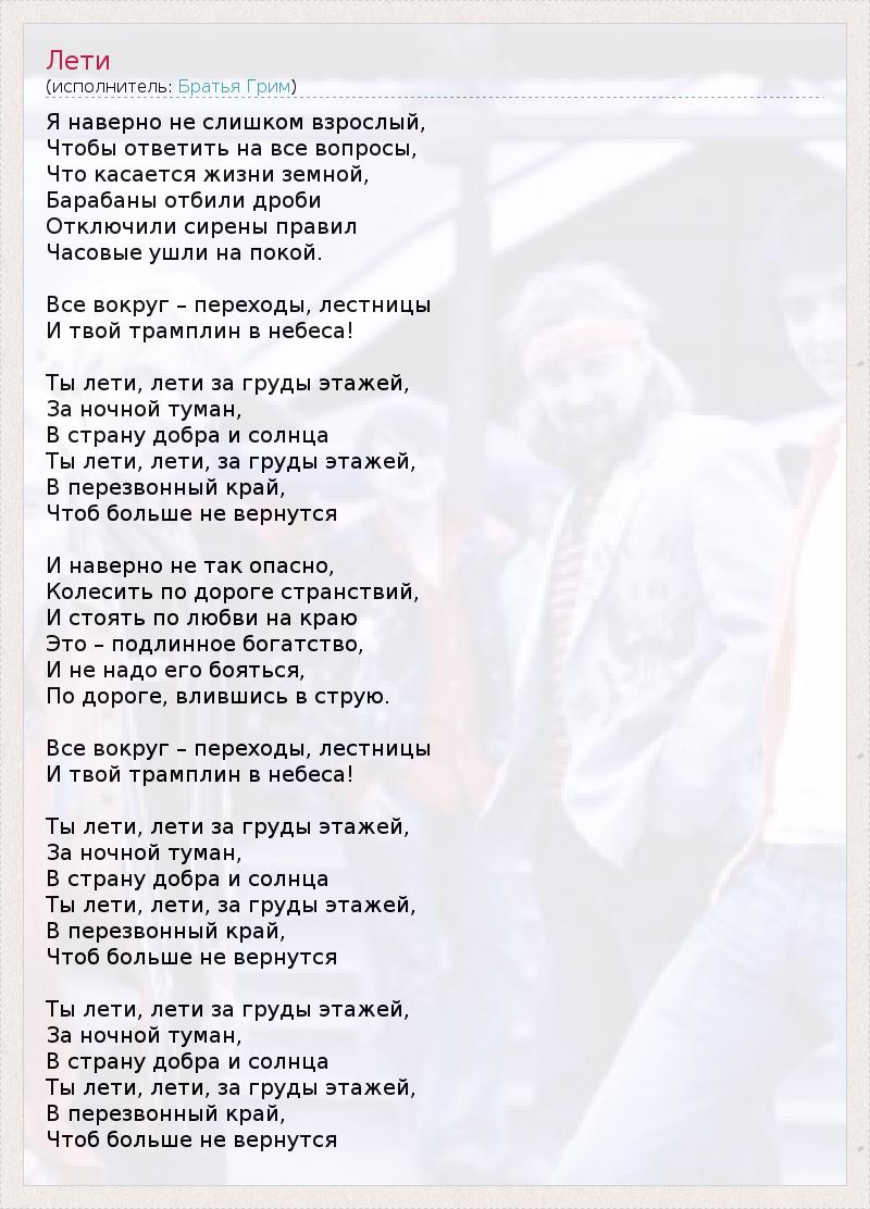 Это интересно:История коллектива началась в 1998 году, когда братья-близнецы Борис и Константин Бурдаевы создали в городе Самара собственную группу «Магелан». Первый концерт состоялся в местном Медико-техническом лицее. Через три года ребята появляются в Москве, где выступают со своим проектом Bossanova Band.В 2004 году друг «Братьев Грим» из Санкт-Петербурга отправляет их демо-запись в Новосибирск. Оттуда... продолжение
