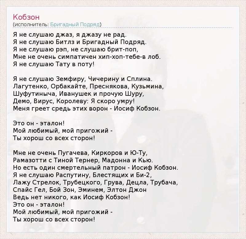 Я не слушаю джаз, я джазу не рад. Я не слушаю Битлз и Бригадный Подряд. Я не слушаю рэп, не слушаю брит-поп, Мне не очень симпатичен хип-хоп-тебе-в лоб. Я не слушаю Тату в поту! Я не слушаю Земфиру, Чичерину и Сплина. Лагутенко, Орбакайте, Преснякова, Кузьмина, Шуфутиныча, Иванушек и прочую Шуру, Демо, Вирус, Королеву: Я скоро умру! Меня греет средь этих ворон - Иосиф Кобзон. Это он - эталон! Мой любимый, мой пригожий - Ты хорош со всех сторон! Мне не очень Пугачева, Киркоров и Ю-Ту, Рамазотти с Тиной Тернер, Мадонна и Кью. Но есть один смертельный патрон - Иосиф Кобзон. Я не слушаю Распутину, Блестящих и Би-2, Лажу Стрелок, Трубецкого, Грува, Децла, Трубача, Спайс Гел, Бой Зон, Эминем, Элтон Джон Ведь нет никого, как Иосиф Кобзон! Это он - эталон! Мой любимый, мой пригожий - Ты хорош со всех сторон!