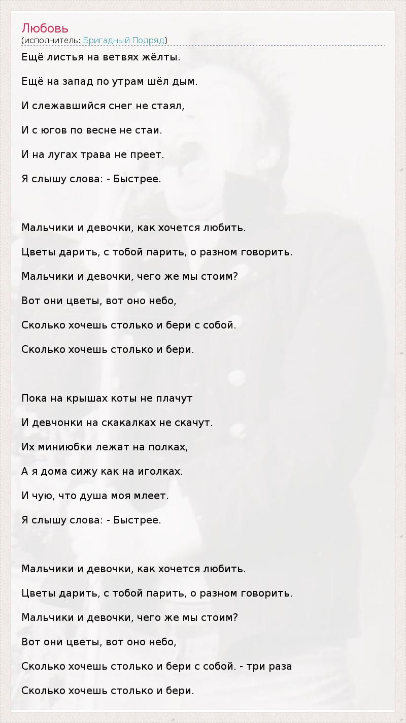 Это интересно:Основные участники оригинального состава легендарной группы «Бригадный Подряд» Николай Михайлов, Александр «Сантёр» Лукьянов и Дмитрий Бабич были знакомы ещё с пятого класса и на протяжении первой половины 80-х успели собрать и распустить несколько школьных групп, игравших самую разную музыку. На ранних этапах в ней играл и их одноклассник, Максим Васильев, который, вместе с Михайловым,... продолжение
