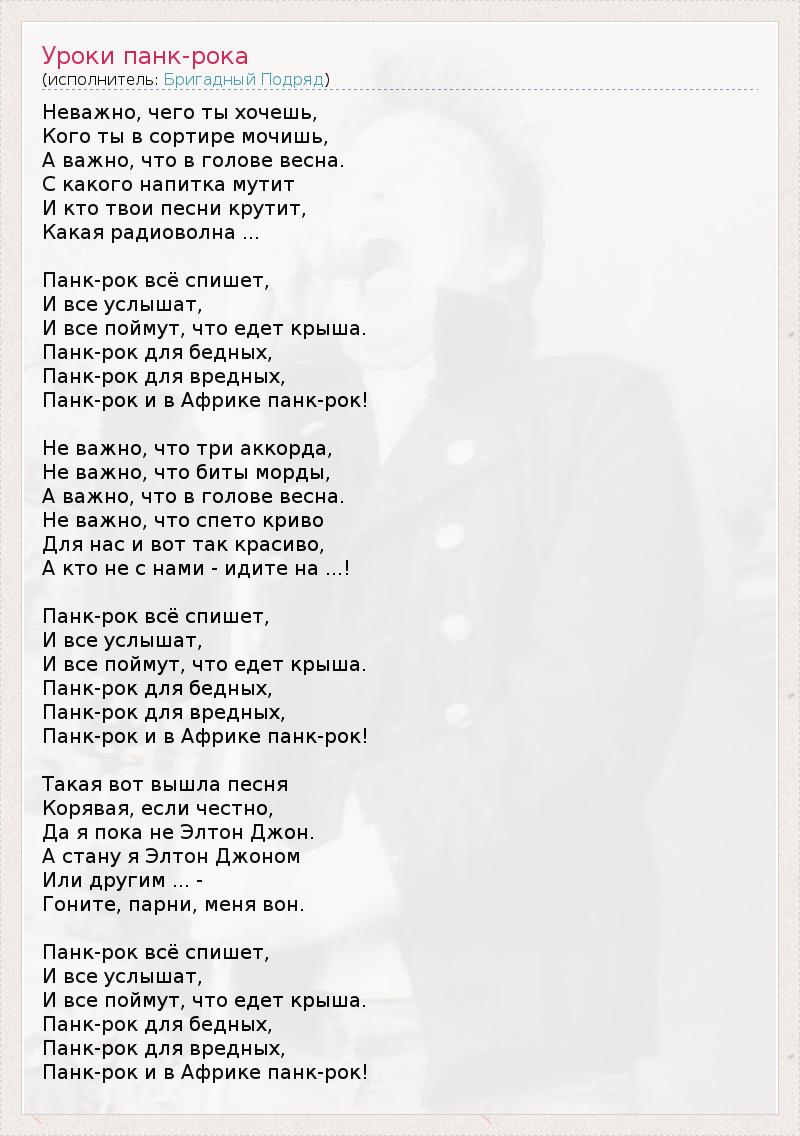 Неважно, чего ты хочешь, Кого ты в сортире мочишь, А важно, что в голове весна. С какого напитка мутит И кто твои песни крутит, Какая радиоволна ... Панк-рок всё спишет, И все услышат, И все поймут, что едет крыша. Панк-рок для бедных, Панк-рок для вредных, Панк-рок и в Африке панк-рок! Не важно, что три аккорда, Не важно, что биты морды, А важно, что в голове весна. Не важно, что спето криво Для нас и вот так красиво, А кто не с нами - идите на ...! Панк-рок всё спишет, И все услышат, И все поймут, что едет крыша. Панк-рок для бедных, Панк-рок для вредных, Панк-рок и в Африке панк-рок! Такая вот вышла песня Корявая, если честно, Да я пока не Элтон Джон. А стану я Элтон Джоном Или другим ... - Гоните, парни, меня вон. Панк-рок всё спишет, И все услышат, И все поймут, что едет крыша. Панк-рок для бедных, Панк-рок для вредных, Панк-рок и в Африке панк-рок!