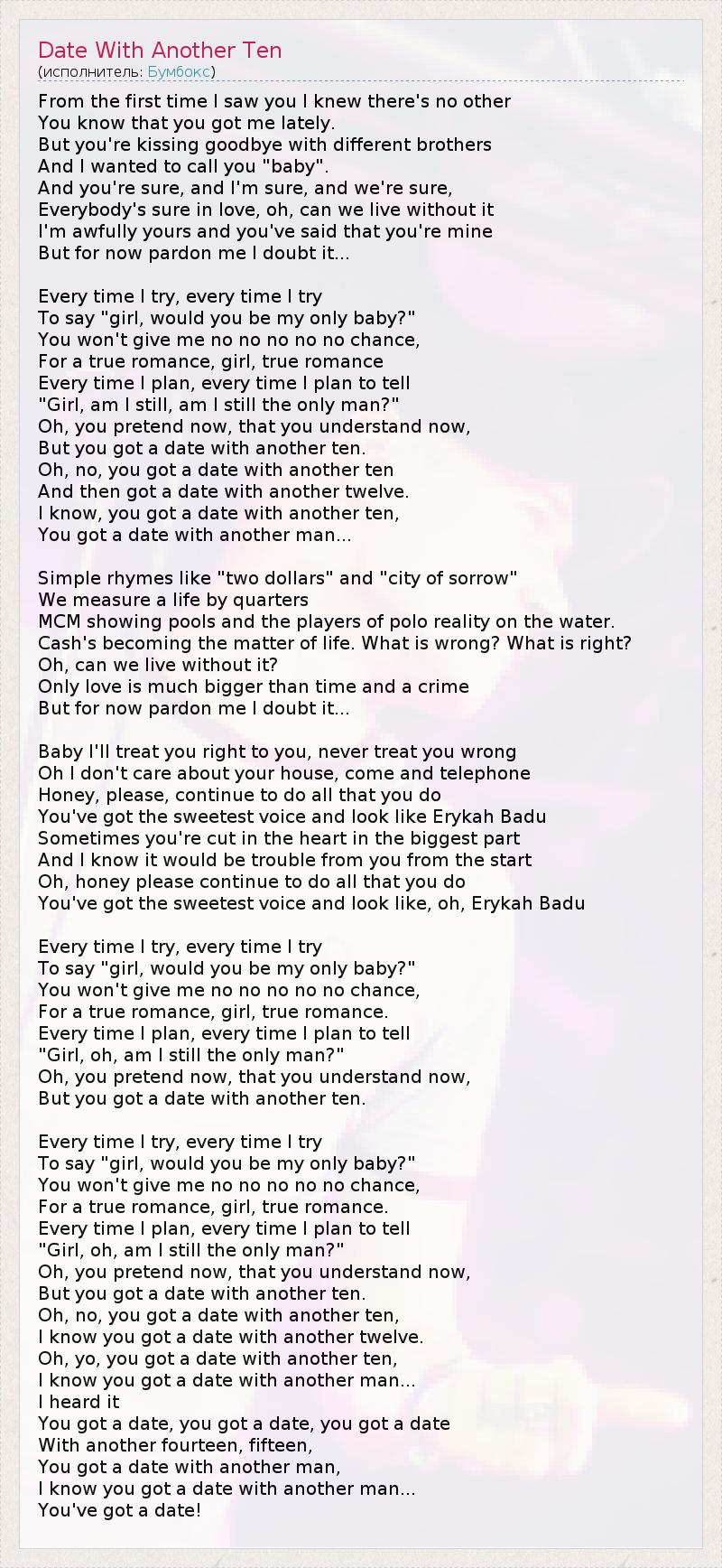 А как ты думаешь, о чем песня "Date With Another Ten" ?