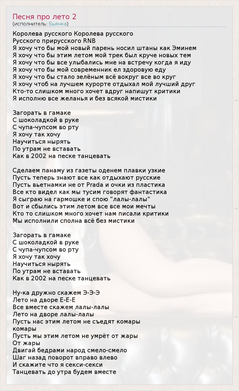 Королева русского Королева русского Русского прирусского RNB Я хочу что бы мой новый парень носил штаны как Эминем Я хочу что бы этим летом мой трек был круче новых тем Я хочу что бы все улыбались мне на встречу когда я иду Я хочу что бы мой современник ел здоровую еду Я хочу что бы стало зелёным всё вокруг все во круг Я хочу чтоб на лучшем курорте отдыхал мой лучший друг Кто-то слишком много хочет вдруг напишут критики Я исполню все желанья и без всякой мистики Загорать в гамаке С шоколадкой в руке С чупа-чупсом во рту Я хочу так хочу Научиться нырять По утрам не вставать Как в 2002 на песке танцевать Сделаем панаму из газеты оденем плавки узкие Пусть теперь знают все как отдыхают русские Пусть вьетнамки не от Prada и очки из пластика Все кто видел как мы тусим говорят фантастика Я сыграю на гармошке и спою "лалы-лалы" Вот и сбылись этим летом все все мои мечты Кто то слишком много хочет нам писали критики Мы исполнили сполна всё без мистики Загорать в гамаке С шоколадкой в руке С чупа-чупсом во рту Я хочу так хочу Научиться нырять По утрам не вставать Как в 2002 на песке танцевать Ну-ка дружно скажем Э-Э-Э Лето на дворе Е-Е-Е Все вместе скажем лалы-лалы Лето на дворе лалы-лалы Пусть нас этим летом не съедят комары комары Пусть мы этим летом не умрёт от жары От жары Двигай бедрами народ смело-смело Шаг назад поворот вправо влево И скажите что я секси-секси Танцевать до утра будем вместе