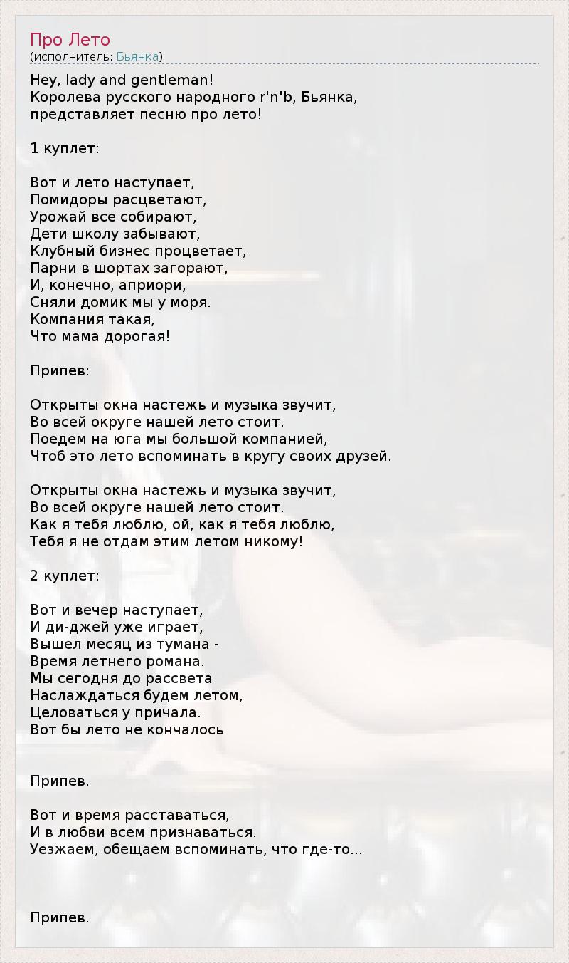 Hey, lady and gentleman! Королева русского народного r'n'b, Бьянка, представляет песню про лето! 1 куплет: Вот и лето наступает, Помидоры расцветают, Урожай все собирают, Дети школу забывают, Клубный бизнес процветает, Парни в шортах загорают, И, конечно, априори, Сняли домик мы у моря. Компания такая, Что мама дорогая! Припев: Открыты окна настежь и музыка звучит, Во всей округе нашей лето стоит. Поедем на юга мы большой компанией, Чтоб это лето вспоминать в кругу своих друзей. Открыты окна настежь и музыка звучит, Во всей округе нашей лето стоит. Как я тебя люблю, ой, как я тебя люблю, Тебя я не отдам этим летом никому! 2 куплет: Вот и вечер наступает, И ди-джей уже играет, Вышел месяц из тумана - Время летнего романа. Мы сегодня до рассвета Наслаждаться будем летом, Целоваться у причала. Вот бы лето не кончалось Припев. Вот и время расставаться, И в любви всем признаваться. Уезжаем, обещаем вспоминать, что где-то... Припев.
