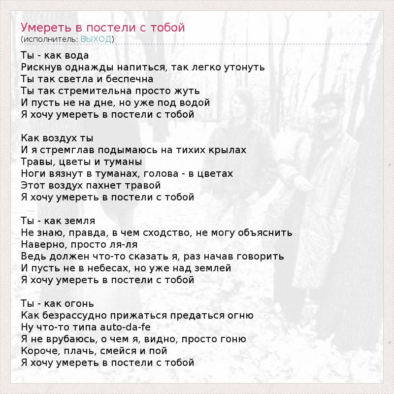 ГлавнаяИсполнителиВЫХОДУмереть в постели с тобой