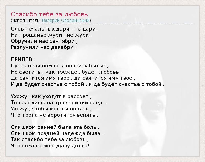 Слов печальных дари - не дари . На прощанье жури - не жури . Обручили нас сентябри , Разлучили нас декабри . ПРИПЕВ : Пусть не вспомню я ночей забытье , Но светить , как прежде , будет любовь . Да святится имя твое , да святится имя твое , И да будет счастье с тобой , и да будет счастье с тобой . Ухожу , как уходят в рассвет , Только лишь на траве синий след . Ухожу , чтобы мог ты понять , Что тропа не воротится вспять . Слишком ранней была эта боль . Слишком поздней надежда была . Так спасибо тебе за любовь , Что сожгла мою душу дотла!