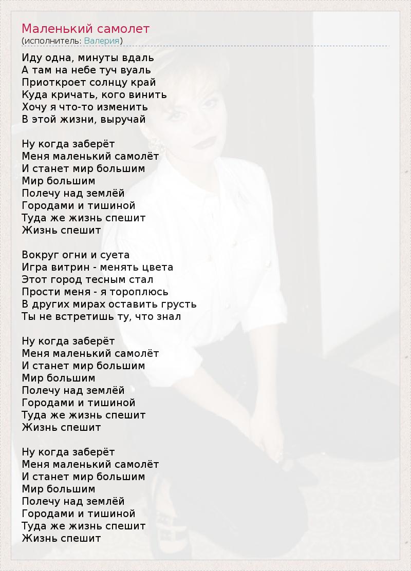 Иду одна, минуты вдаль А там на небе туч вуаль Приоткроет солнцу край Куда кричать, кого винить Хочу я что-то изменить В этой жизни, выручай Ну когда заберёт Меня маленький самолёт И станет мир большим Мир большим Полечу над землёй Городами и тишиной Туда же жизнь спешит Жизнь спешит Вокруг огни и суета Игра витрин - менять цвета Этот город тесным стал Прости меня - я тороплюсь В других мирах оставить грусть Ты не встретишь ту, что знал Ну когда заберёт Меня маленький самолёт И станет мир большим Мир большим Полечу над землёй Городами и тишиной Туда же жизнь спешит Жизнь спешит Ну когда заберёт Меня маленький самолёт И станет мир большим Мир большим Полечу над землёй Городами и тишиной Туда же жизнь спешит Жизнь спешит