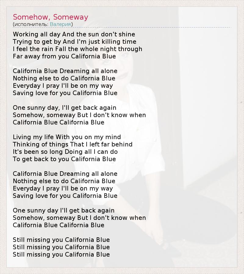 Working all day And the sun don't shine Trying to get by And I'm just killing time I feel the rain Fall the whole night through Far away from you California Blue California Blue Dreaming all alone Nothing else to do California Blue Everyday I pray I'll be on my way Saving love for you California Blue One sunny day, I'll get back again Somehow, someway But I don't know when California Blue California Blue Living my life With you on my mind Thinking of things That I left far behind It's been so long Doing all I can do To get back to you California Blue California Blue Dreaming all alone Nothing else to do California Blue Everyday I pray I'll be on my way Saving love for you California Blue One sunny day I'll get back again Somehow, someway But I don't know when California Blue California Blue Still missing you California Blue Still missing you California Blue Still missing you California Blue
