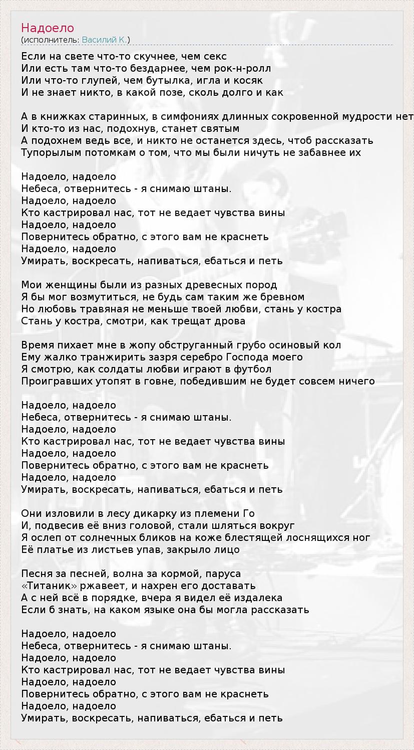 Это интересно:…поэт, совмещающий просторечия и самояз с энциклопедическими терминами, грубость с нежностью, прямолинейную лозунговость с философичностью размышлений; музыкант, легко владеющий инструментом, но не стесняющийся подавать его с животной примитивностью; создающий красивые мелодические построения, запросто разрушаемые частоколом грубых риффов; использующий мировой опыт рок-н-ролла,... продолжение