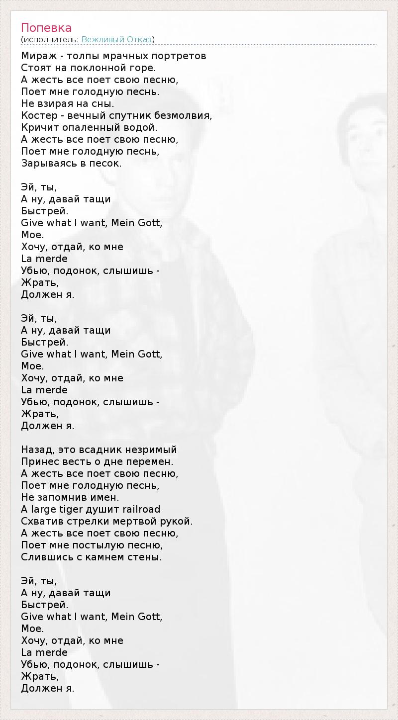 Это интересно:ВЕЖЛИВЫЙ ОТКАЗ V E Z H L I V I Y O T K A ZИСТОРИЧЕСКАЯ СПРАВКАРоман Суслов "Вежливый отказ"- московская музыкальная группа, созданная в 1985 году студентами и выпускниками МИФИ . Первыми участниками были Пётр Плавинский - автор названия группы, ряда песен и клавишник , Роман Суслов - автор другого ряда песен, гитарист, Дмитрий Шумилов - вокалист, Михаил Верещагин... продолжение