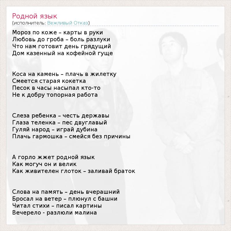 Это интересно:ВЕЖЛИВЫЙ ОТКАЗ V E Z H L I V I Y O T K A ZИСТОРИЧЕСКАЯ СПРАВКАРоман Суслов "Вежливый отказ"- московская музыкальная группа, созданная в 1985 году студентами и выпускниками МИФИ . Первыми участниками были Пётр Плавинский - автор названия группы, ряда песен и клавишник , Роман Суслов - автор другого ряда песен, гитарист, Дмитрий Шумилов - вокалист, Михаил Верещагин... продолжение