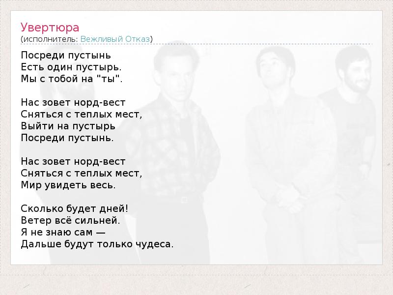 Это интересно:ВЕЖЛИВЫЙ ОТКАЗ V E Z H L I V I Y O T K A ZИСТОРИЧЕСКАЯ СПРАВКАРоман Суслов "Вежливый отказ"- московская музыкальная группа, созданная в 1985 году студентами и выпускниками МИФИ . Первыми участниками были Пётр Плавинский - автор названия группы, ряда песен и клавишник , Роман Суслов - автор другого ряда песен, гитарист, Дмитрий Шумилов - вокалист, Михаил Верещагин... продолжение