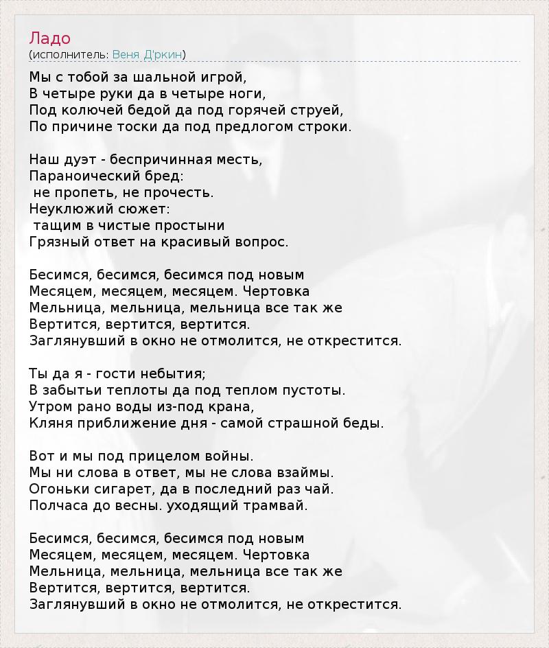 Это интересно:Веня Д’ркин — творческий псевдоним Александра Михайловича Литвинова. Родился 11 июня 1970 года в пос. Должанском, Свердловского р-на Луганской области, Украина. Сменил множество профессий, был художником, комбайнером, водителем, слесарем, сторожем, учителем физики. Писать стихи он начал еще в детстве.Веня Д'ркин - это автор-исполнитель, поэт, сказочник. Творчество Вени Д’ркина находится... продолжение