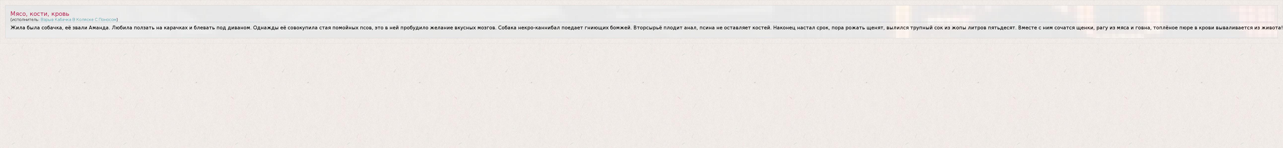 Once there was a dog, her name was Amanda . She loved to crawl on all fours and puke under the sofa . One of her dogs copulate pack of rubbish , it has awakened a desire in her delicious brains. Dog necro - cannibal eats rotting homeless. Recyclables anal breeds , dog does not leave the bones. Finally came the term , it is time to give birth to puppies, resulted corpse juice from asses and fifty liters . With him ooze puppies , stew meat and shit , mashed melted in the blood falls from the belly !