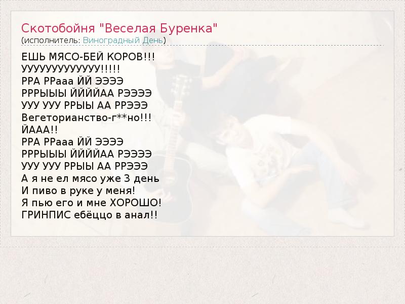 ГлавнаяИсполнителиВиноградный ДеньСкотобойня "Веселая Буренка"