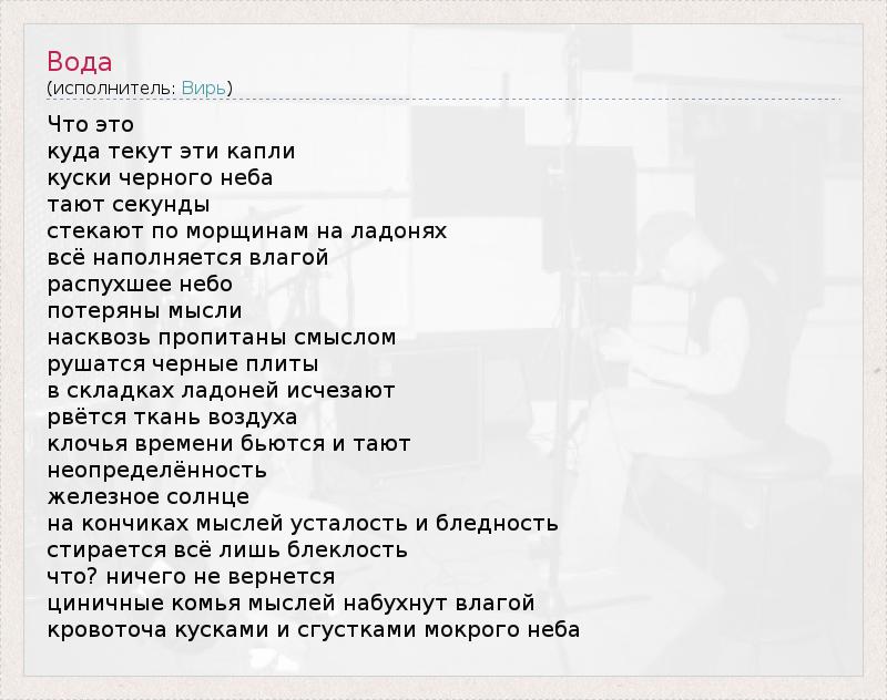 Это интересно:В 1998 году участники группы Жёлтый Дом (1996-1998) Сергей Милушкин и Алексей Андреев сменили название коллектива на "ВИРЬ". Название взято из одноименного произведения И.А. Бунина.Первый концерт прошел 9 марта 2000 года в клубе "Intoyo". В течение последующих лет были сделаны три демо-записи и сыграно более пятидесяти концертов в Москве, С-Петербурге,... продолжение