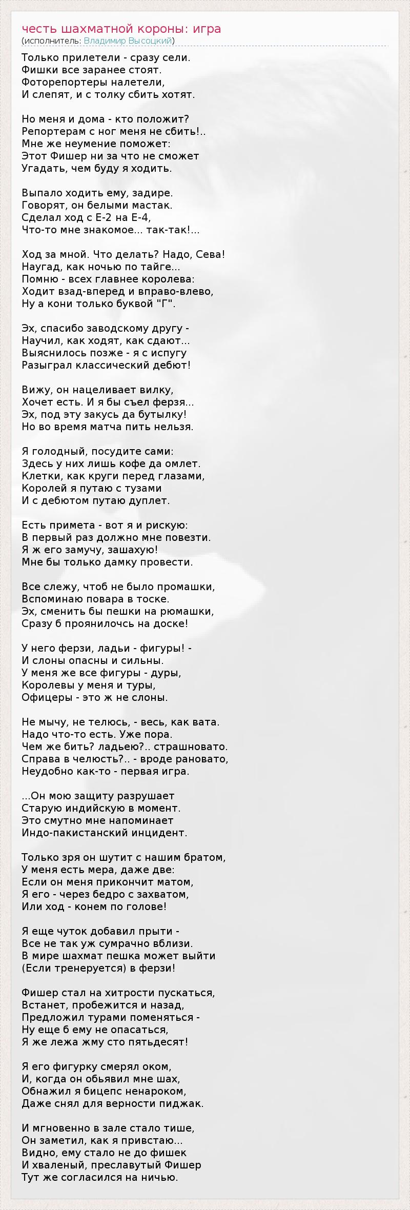 ГлавнаяИсполнителиВладимир Высоцкийчесть шахматной короны: игра