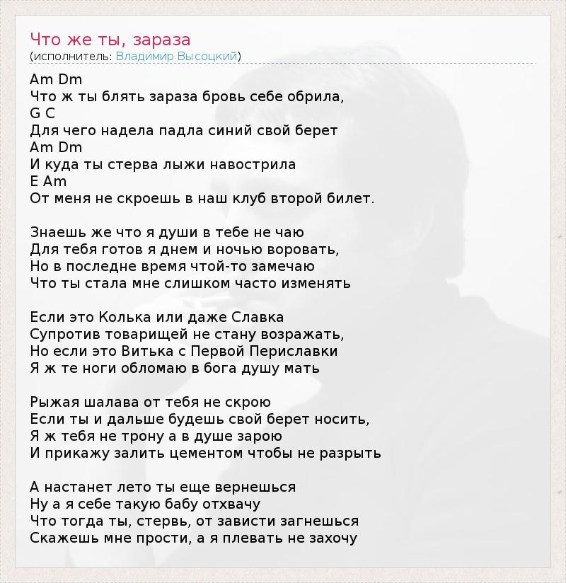 Am Dm Что ж ты блять зараза бровь себе обрила, G C Для чего надела падла синий свой берет Am Dm И куда ты стерва лыжи навострила E Am От меня не скроешь в наш клуб второй билет. Знаeшь же что я души в тебе не чаю Для тебя готов я днем и ночью воровать, Но в последне время чтой-то замечаю Что ты стала мне слишком часто изменять Если это Колька или даже Славка Супротив товарищей не стану возражать, Но если это Витька c Первой Периславки Я ж те ноги обломаю в бога душу мать Рыжая шалава от тебя не скрою Если ты и дальше будешь свой берет ноcить, Я ж тебя не трону a в душе зарою И прикажу залить цементом чтобы не разрыть A настанет лето ты еще вернешься Ну a я себе такую бабу отхвачу Что тогда ты, стервь, от зависти загнешься Скажешь мне прости, a я плевать не захочу
