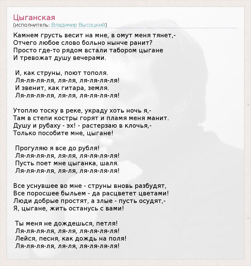 Это интересно:Владимир Семёнович Высоцкий (25 января 1938, Москва — 25 июля 1980) — советский поэт, музыкант, актёр, автор многих сотен песен на собственные стихи. В качестве автора и исполнителя песен собственного сочинения под гитару завоевал широкую популярность. В начале 1960-х годов появились первые песни Высоцкого. Песня «Татуировка», написанная в 1961 году в Ленинграде, многими считается первой. Неоднократно... продолжение