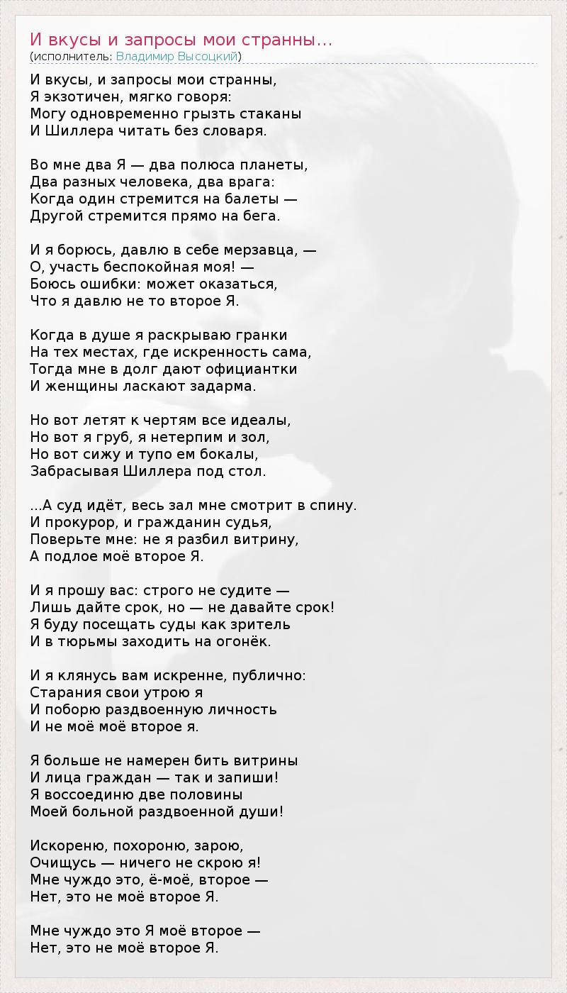 А как ты думаешь, о чем песня "И вкусы и запросы мои странны…" ?