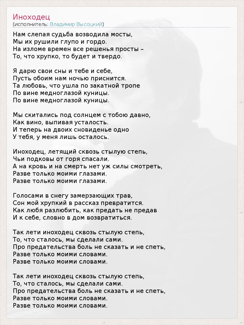 Это интересно:Владимир Семёнович Высоцкий (25 января 1938, Москва — 25 июля 1980) — советский поэт, музыкант, актёр, автор многих сотен песен на собственные стихи. В качестве автора и исполнителя песен собственного сочинения под гитару завоевал широкую популярность. В начале 1960-х годов появились первые песни Высоцкого. Песня «Татуировка», написанная в 1961 году в Ленинграде, многими считается первой. Неоднократно... продолжение