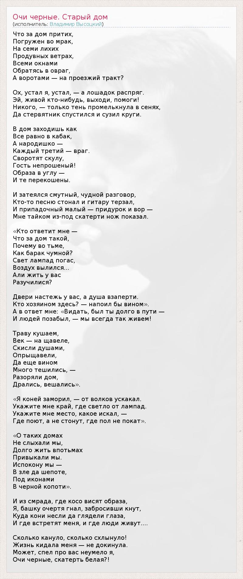 ГлавнаяИсполнителиВладимир ВысоцкийОчи черные. Старый дом