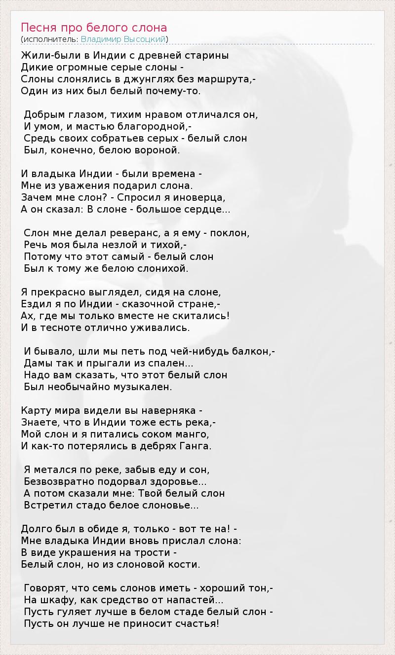 ГлавнаяИсполнителиВладимир ВысоцкийПесня про белого слона