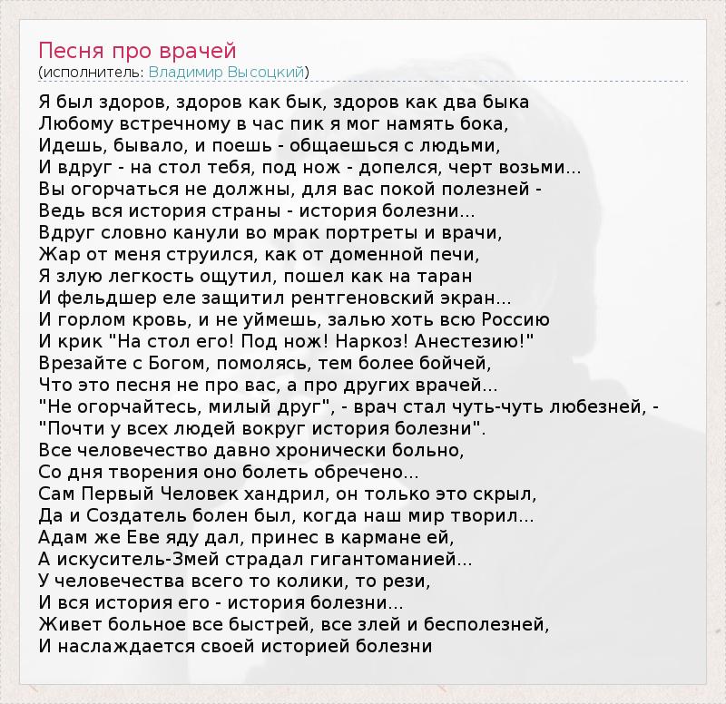 Я был здоров, здоров как бык, здоров как два быка Любому встречному в час пик я мог намять бока, Идешь, бывало, и поешь - общаешься с людьми, И вдруг - на стол тебя, под нож - допелся, черт возьми... Вы огорчаться не должны, для вас покой полезней - Ведь вся история страны - история болезни... Вдруг словно канули во мрак портреты и врачи, Жар от меня струился, как от доменной печи, Я злую легкость ощутил, пошел как на таран И фельдшер еле защитил рентгеновский экран... И горлом кровь, и не уймешь, залью хоть всю Россию И крик "На стол его! Под нож! Наркоз! Анестезию!" Врезайте с Богом, помолясь, тем более бойчей, Что это песня не про вас, а про других врачей... "Не огорчайтесь, милый друг", - врач стал чуть-чуть любезней, - "Почти у всех людей вокруг история болезни". Все человечество давно хронически больно, Со дня творения оно болеть обречено... Сам Первый Человек хандрил, он только это скрыл, Да и Создатель болен был, когда наш мир творил... Адам же Еве яду дал, принес в кармане ей, А искуситель-Змей страдал гигантоманией... У человечества всего то колики, то рези, И вся история его - история болезни... Живет больное все быстрей, все злей и бесполезней, И наслаждается своей историей болезни