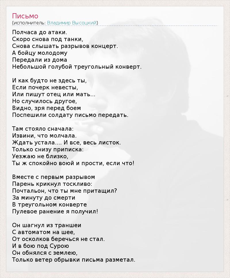 Это интересно:Владимир Семёнович Высоцкий (25 января 1938, Москва — 25 июля 1980) — советский поэт, музыкант, актёр, автор многих сотен песен на собственные стихи. В качестве автора и исполнителя песен собственного сочинения под гитару завоевал широкую популярность. В начале 1960-х годов появились первые песни Высоцкого. Песня «Татуировка», написанная в 1961 году в Ленинграде, многими считается первой. Неоднократно... продолжение