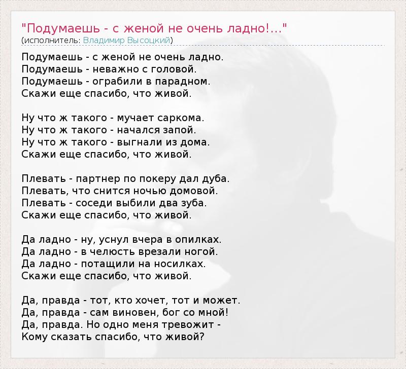 А как ты думаешь, о чем песня ""Подумаешь - с женой не очень ладно!..."" ?