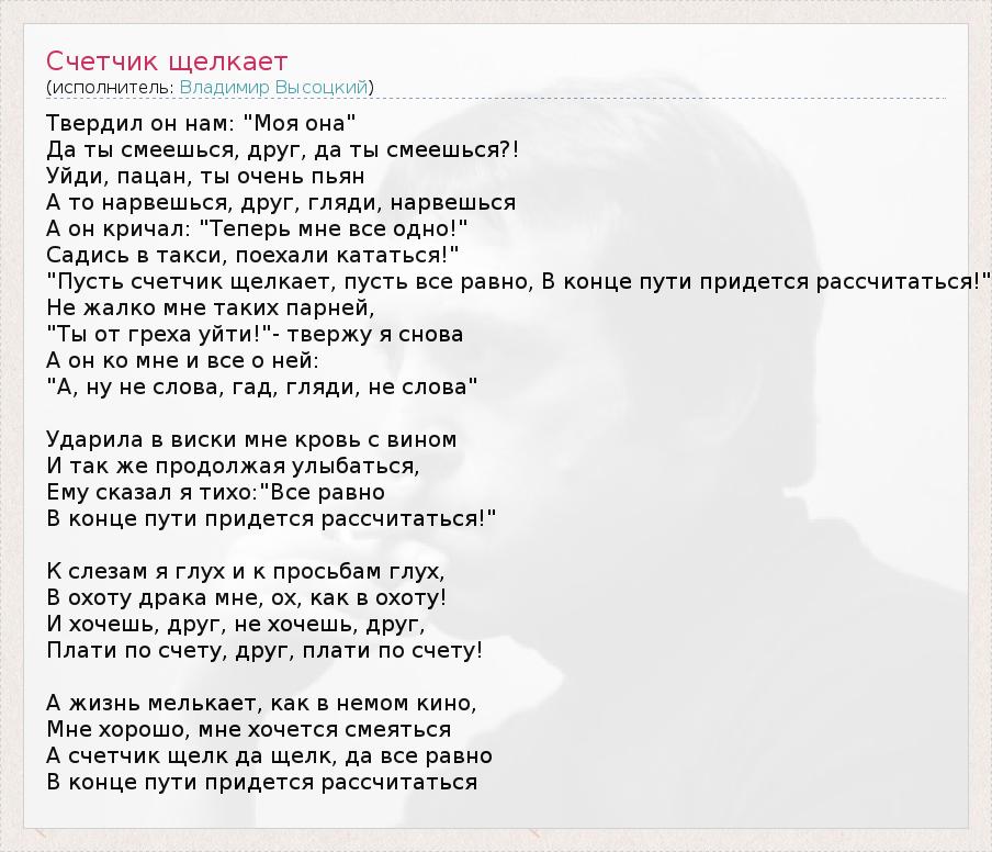 "Пусть счетчик щелкает, пусть все равно, В конце пути придется рассчитаться!"