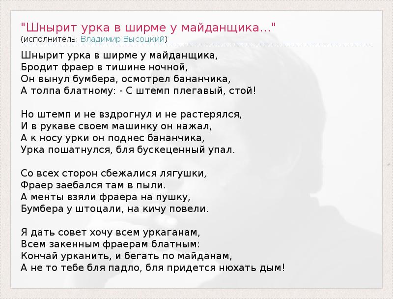 А как ты думаешь, о чем песня ""Шнырит урка в ширме у майданщика..."" ?