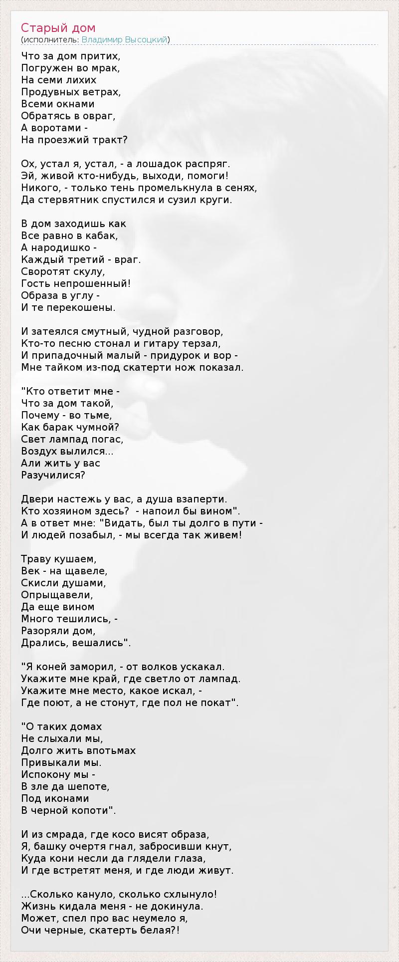Это интересно:Владимир Семёнович Высоцкий (25 января 1938, Москва — 25 июля 1980) — советский поэт, музыкант, актёр, автор многих сотен песен на собственные стихи. В качестве автора и исполнителя песен собственного сочинения под гитару завоевал широкую популярность. В начале 1960-х годов появились первые песни Высоцкого. Песня «Татуировка», написанная в 1961 году в Ленинграде, многими считается первой. Неоднократно... продолжение