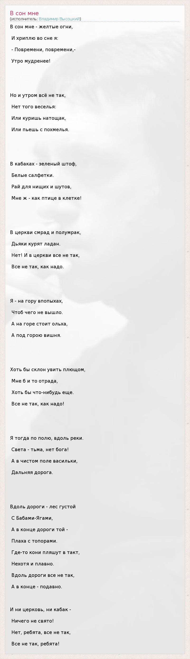 Это интересно:Владимир Семёнович Высоцкий (25 января 1938, Москва — 25 июля 1980) — советский поэт, музыкант, актёр, автор многих сотен песен на собственные стихи. В качестве автора и исполнителя песен собственного сочинения под гитару завоевал широкую популярность. В начале 1960-х годов появились первые песни Высоцкого. Песня «Татуировка», написанная в 1961 году в Ленинграде, многими считается первой. Неоднократно... продолжение