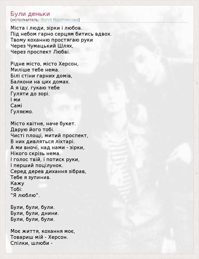 Mista i people zіrki i love. Pid sky Garneau insertions bitis vdvoh . Twomey Cohanim prostyagayu hands Through Chumatskyi Shlyakh Lyubvі across the avenue . Ridne Misto , Misto Kherson, Milіshe you dumb . Bіlі stіni Garnier domіv , Balconies on Tsikh homes. I іdu , Hooke you Gulyati to zorі . E ² Samі Gulyaєmo . Misto kvіtne , nache bouquet. Bestow Yogo Tobi . Chistі ploschі , mity Prospect They divlyatsya lіhtarі . A mi Vnochi over us - zіrki , Nіkogo skrіz dumb . ² tvіy voice , i potisk hands ² Pershiy potsіlunok . Sered trees zіbrav respiratory apparatus , Thee I zupiniv . kazhu Tobi : & quot; I love & quot ;. Boule boule boule . Boule boule dnini . Boule boule boule . Moє Zhittya , Cohanim moє , Tovarish 're Mine - Kherson . Spіlki , shlyubi -
