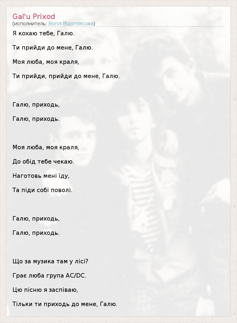 Я кохаю тебе, Галю. Ти прийди до мене, Галю. Моя люба, моя краля, Ти прийди, прийди до мене, Галю. Галю, приходь, Галю, приходь. Моя люба, моя краля, До обiд тебе чекаю. Наготовь менi їду, Та пiди собi поволi. Галю, приходь, Галю, приходь. Що за музика там у лiсi? Грає люба група AC/DC. Цю пiсню я заспiваю, Тiльки ти приходь до мене, Галю.