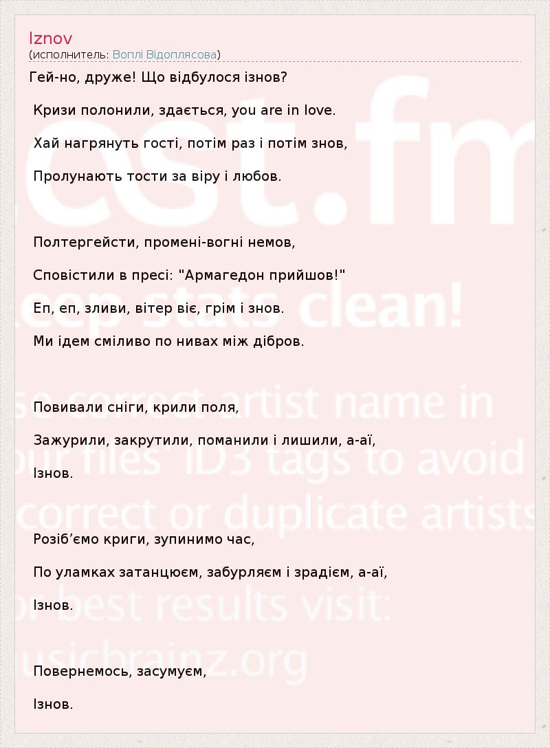 Это интересно:Неправильное название. Вместо кириллического "і", используется латинское. Правильное название: Воплі Відоплясова.Пожалуйста, исправьте это название на верное,нажав справа внизу на кнопку "Предложи правильный вариант",и изменив текущее название на правильное,а именно: Воплі Відоплясова.... продолжение